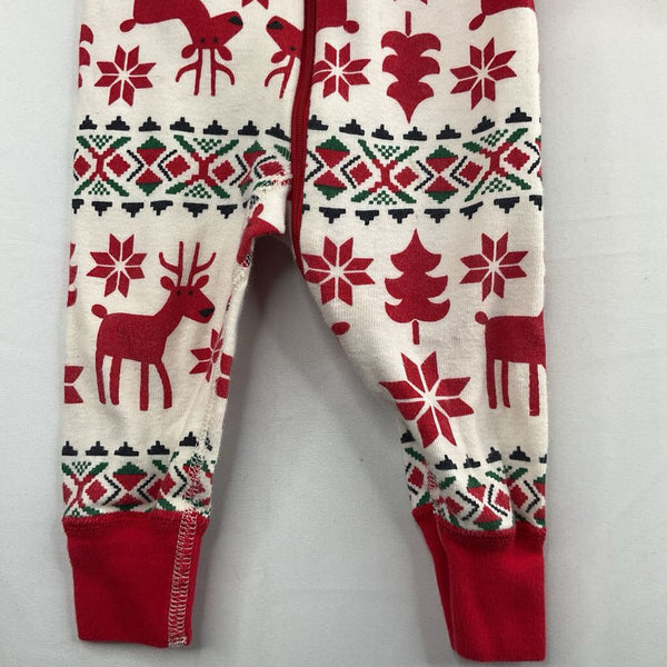 Size 6-12m (70): Hanna Andersson White/Red/Green Snowflakes/Reindeer Organic Cotton 1pc Zip-Up Holiday PJs