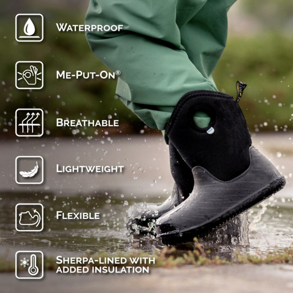 Due to the layer of fleece lining inside these winter boots, we recommend going up one size from your child’s current shoe size. WATERPROOF: Conquers rain, snow, slush & puddles! Made with DWR coated neoprene over durable rubber. Fully waterproof, works as a great pair of cozy rain boots for your toddler. LIGHTWEIGHT: Not clunky like your typical winter boot WARM: Lined with Sherpa fleece for a snug and comfortable fit. Extra insulation layer helps keep feet warm in snow & slush. Rated -10 Degrees C/ 14F with socks on. EASY-ON: Simple finger holes & back pull tab helps toddlers put on these boots all by themselves MACHINE WASHABLE: Machine washable on gentle cycle cold to lukewarm.