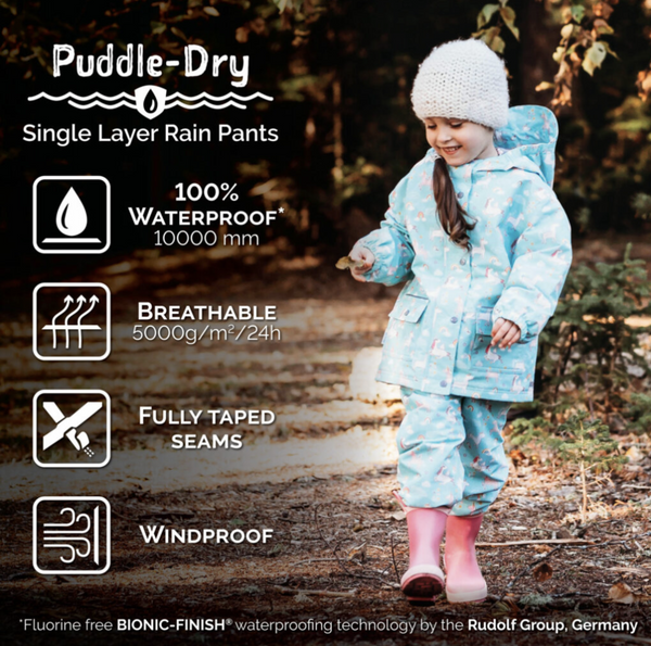 WATERPROOF: With Bionic-Finish® technology from Germany, PVC & fluorine free. Fabric Waterproof Rating: 10000 mm. Fabric Active Breathability: 3000g/m2/24h. WINDPROOF & BREATHABLE: Keeps warmth inside yet allows moisture out. SOIL REPELLENT: Great for active play ADJUSTABLE WAISTBAND: Comfortable elastic waistband that can be further adjusted with a drawstring ELASTIC ANKLE BANDS: To keep out the rain or snow and to fit better for different leg lengths.